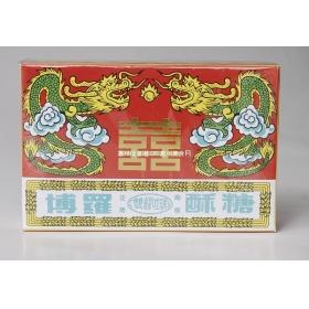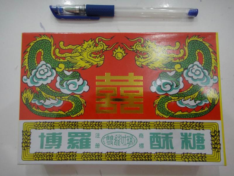罗酥糖,是一种灰色的方块,是由博罗县糖果饼干厂选用当地产的黑白芝麻,以麦芽糖、白沙糖、面粉等作配料,用传统的加工工艺精制而成。每块约为两粒军棋粘合在一起大小。用一个形似新华字典,却比新华字典略大少少的盒子包装。里面装着两层,每层约32块。盒子除了有一位头戴高高的厨师帽,右手托着酥糖盒子,笑容可掬的“厨师人物像”之外,还有一行“博罗特产驰名中外”字样。上个世纪50年代末60年代初的博罗酥糖,真正是风靡粤港澳,酥松可口、甜而不腻名副其实。所谓的酥松,一是拿着它时要小心翼翼,手上稍一使劲,它就散成粉末;二是放入嘴里,会自然化开。